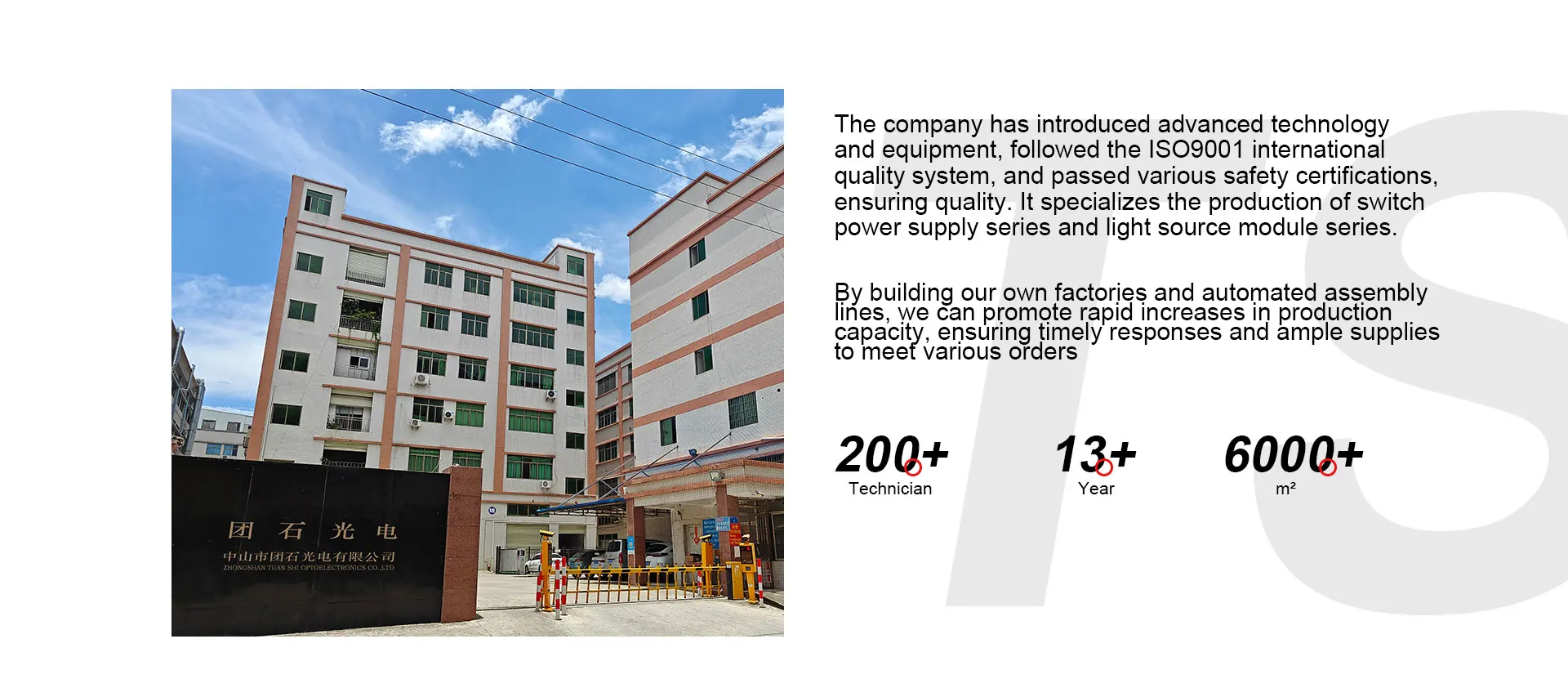 Zhongshan Tuanshi Optoelectronics Co., Ltd. is a manufacturer focusing on the production of switching power supplies, LED lamps and lanterns, no main lights, and advertising light box light sources, with a total factory area of 8,300 square meters, more than 100 experienced employees, and 6 automated production lines, which can complete the whole process of production processes such as lamp beads, lenses, automatic wire welding, testing, aging, etc. Rich export experience, products are exported to Russia, the Middle East, Southeast Asia and other countries and regions;